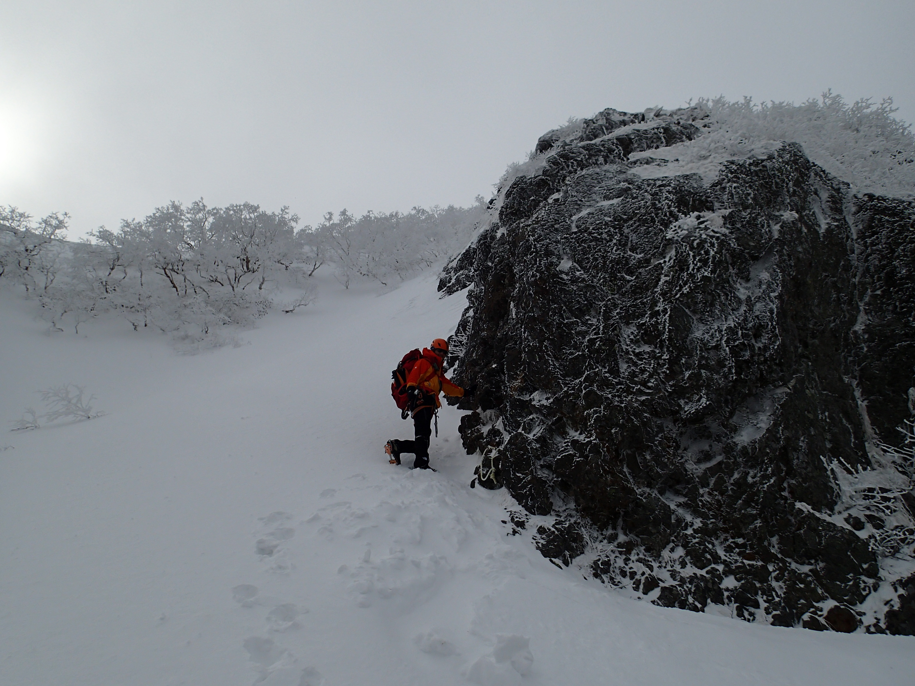 その後、樹林帯をようやく超えて、気が付いてみれば阿弥陀北稜の岩稜取りつきはもう目の前に。取りつきを目指して、途中でアイゼンに変えて、雪壁を登っていく。