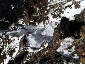途中、クライムダウン困難な壁に出くわし、そこには残置の懸垂点。