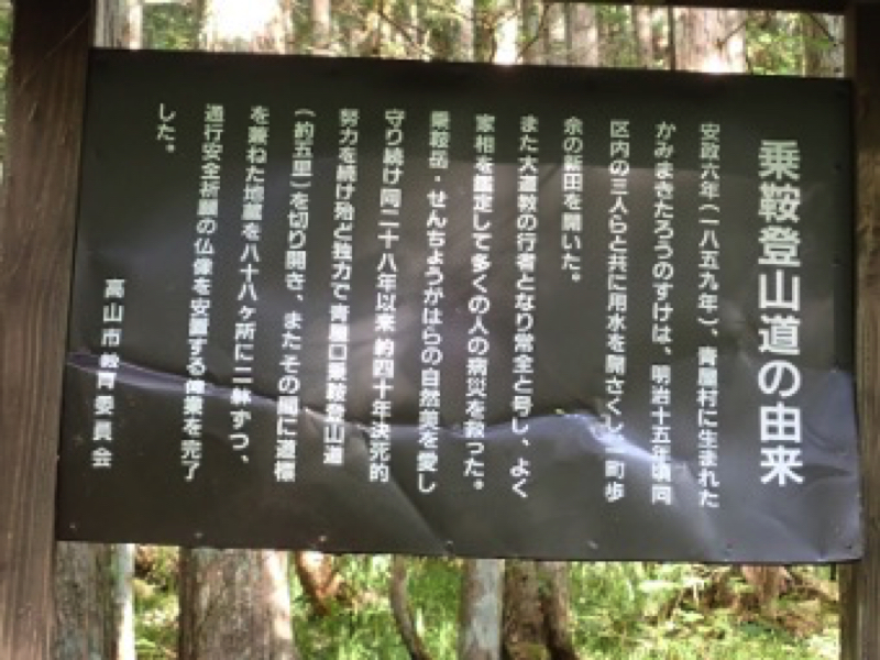 九蔵からの登山道の由来が書かれた看板が登山口にありました。よく88 X 2 = 176躰もの石のお地蔵さまを、標高差2,000mも持ち上げたものです。僕なら下の方にたくさん置いて、上に行くにつれて間隔が広くなりそうです(汗)。