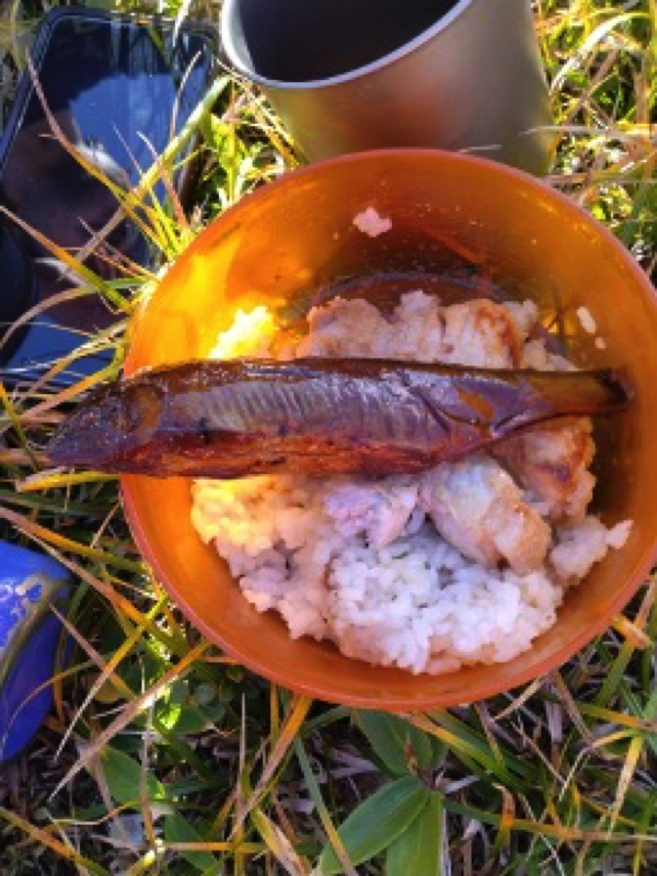 夕食は3種のアルファ米、ジンジャーポークステーキ、子持ち鮎の甘露煮、お味噌汁。そしてサントリーウィスキーの最高峰:響。天気は快晴で夜は満天の星空。天の川もよく見えました。