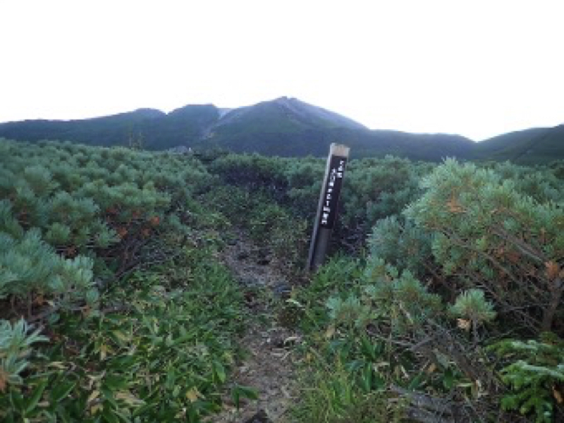 下山は来た道を忠実に辿ります。頂上から避難小屋付近までは森林限界を越えていて、ハイマツ帯の中の登山道となります。日影平山分岐までは良く整備されていて、藪漕ぎもありません。