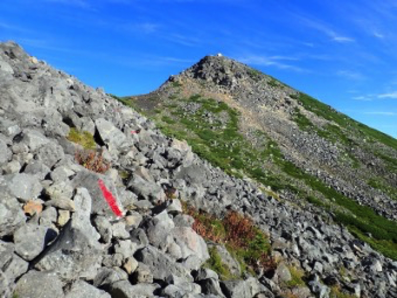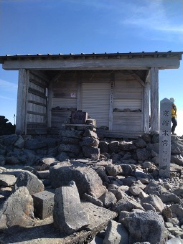 大日岳(奥の院)の南のガラガラした斜面をトラバースしていくと、頂上(剣ヶ峰)の神社が見えてきます。ここまで来れば頂上まではあと一息です。