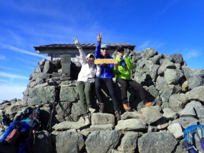 剣ヶ峰に到着です。お決まりの記念撮影。畳平から登ってきた登山者に撮ってもらいました。