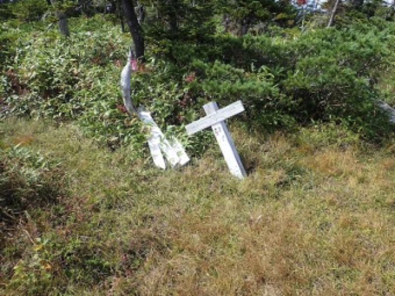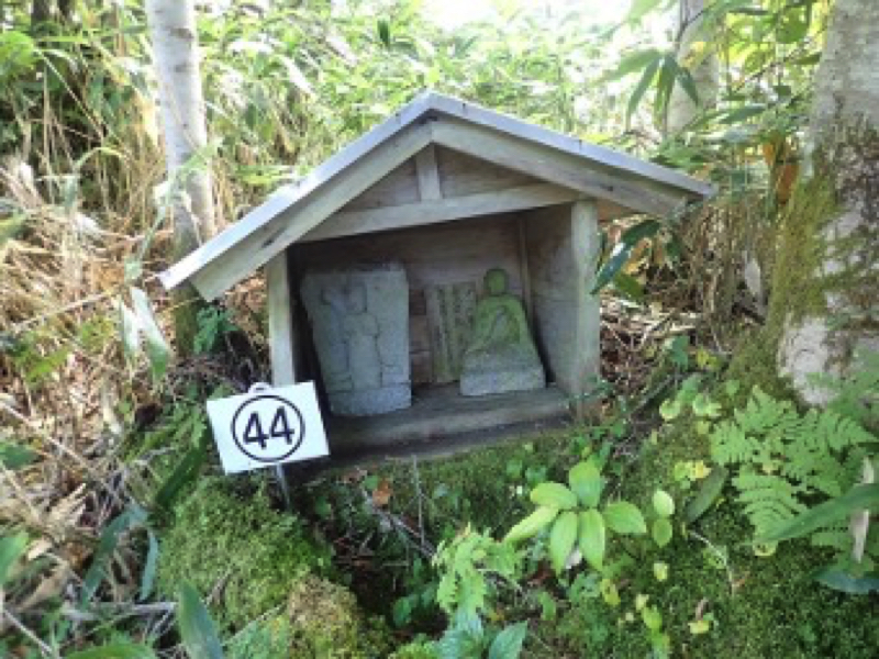 44番目のお地蔵さまです。一度朽ち果てた登山道を再度切り開いた時に発見されたものと思われ、発見者の名前が木札に書かれていました。
