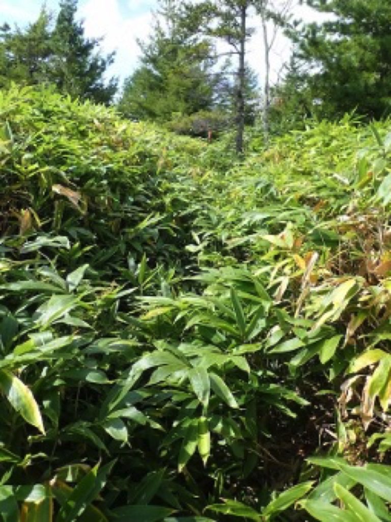 登山道は2年に一度刈り払いを行なっているそうですが、時には背丈よりも高い熊笹の藪漕ぎとなりました。マダニもいました。