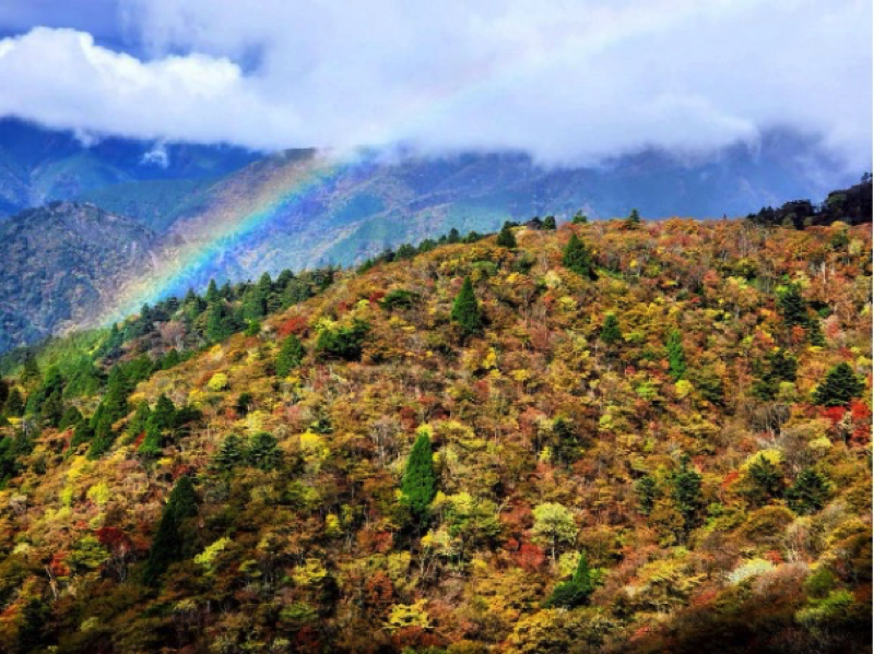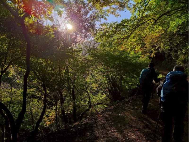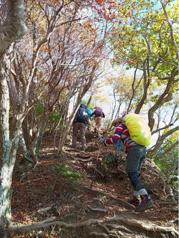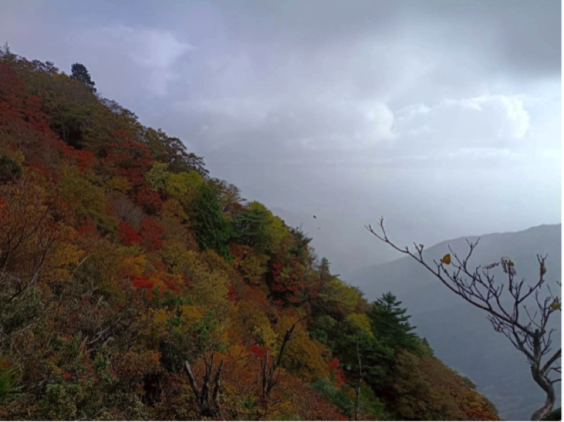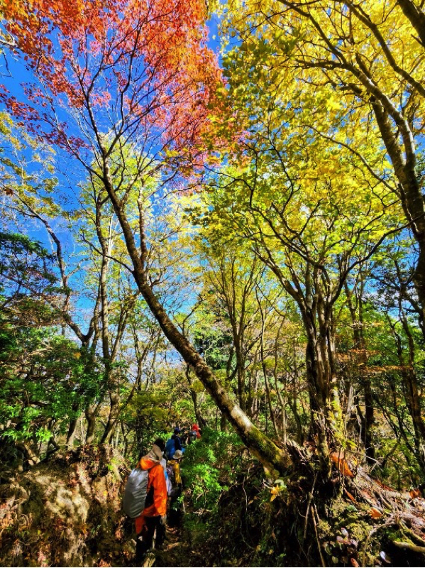 紅葉のグラデーションが見事な中を、風が当たらない穏やかな下山道です。